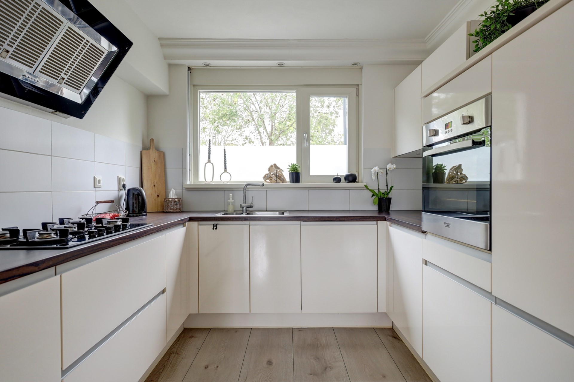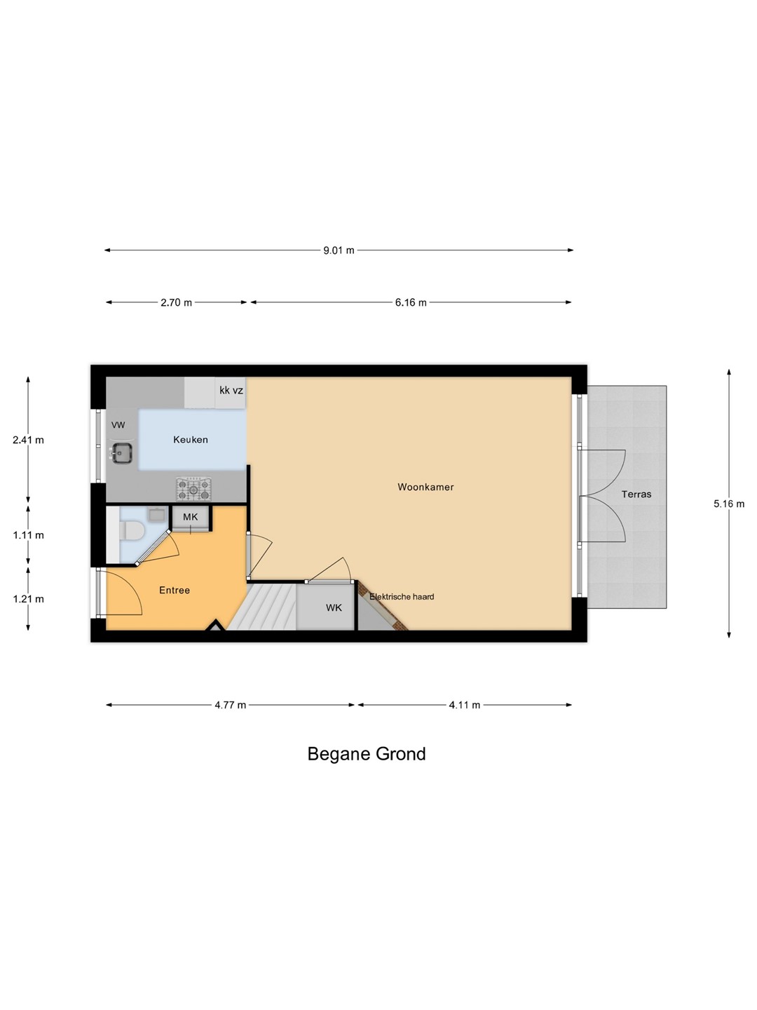 Begane grond: entree; hal met zwevend toilet, meterkast, trapopgang en toegang tot de woonkamer; fijne lichte woonkamer met openslaande deuren naar de tuin en een trapkast; halfopen keuken voorzien van een 5 pits gaskookplaat, oven, afzuigkap, koel-vriescombinatie, heteluchtoven, vaatwasmachine en een spoelbak.