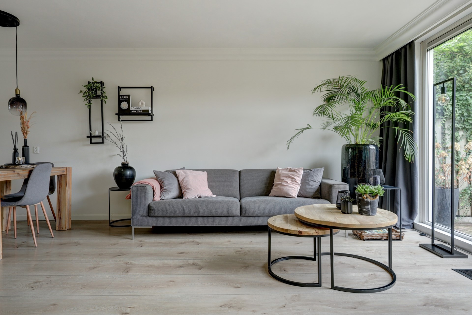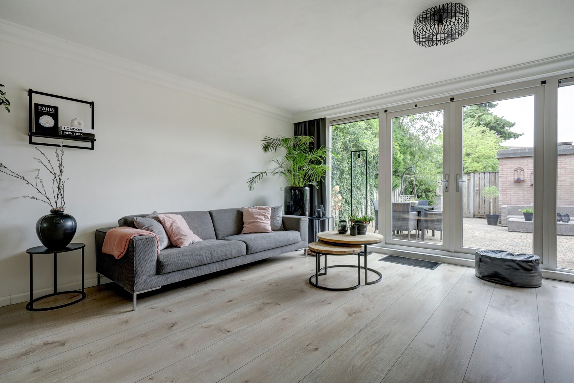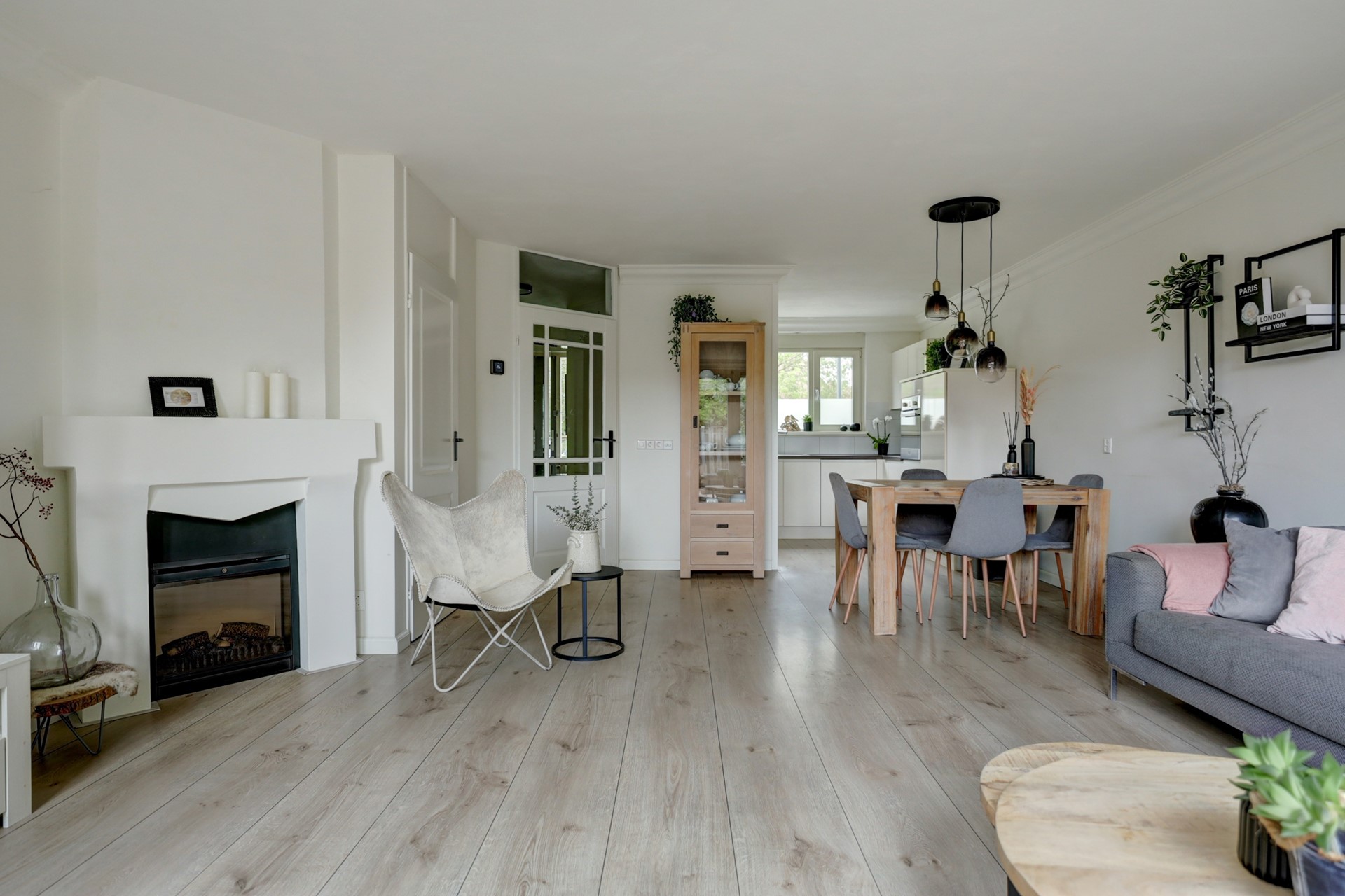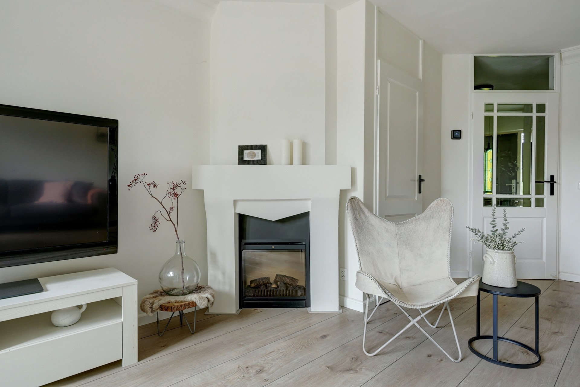 Sfeervolle woonkamer met openslaande deuren en een sierhaard(rookkanaal aanwezig)