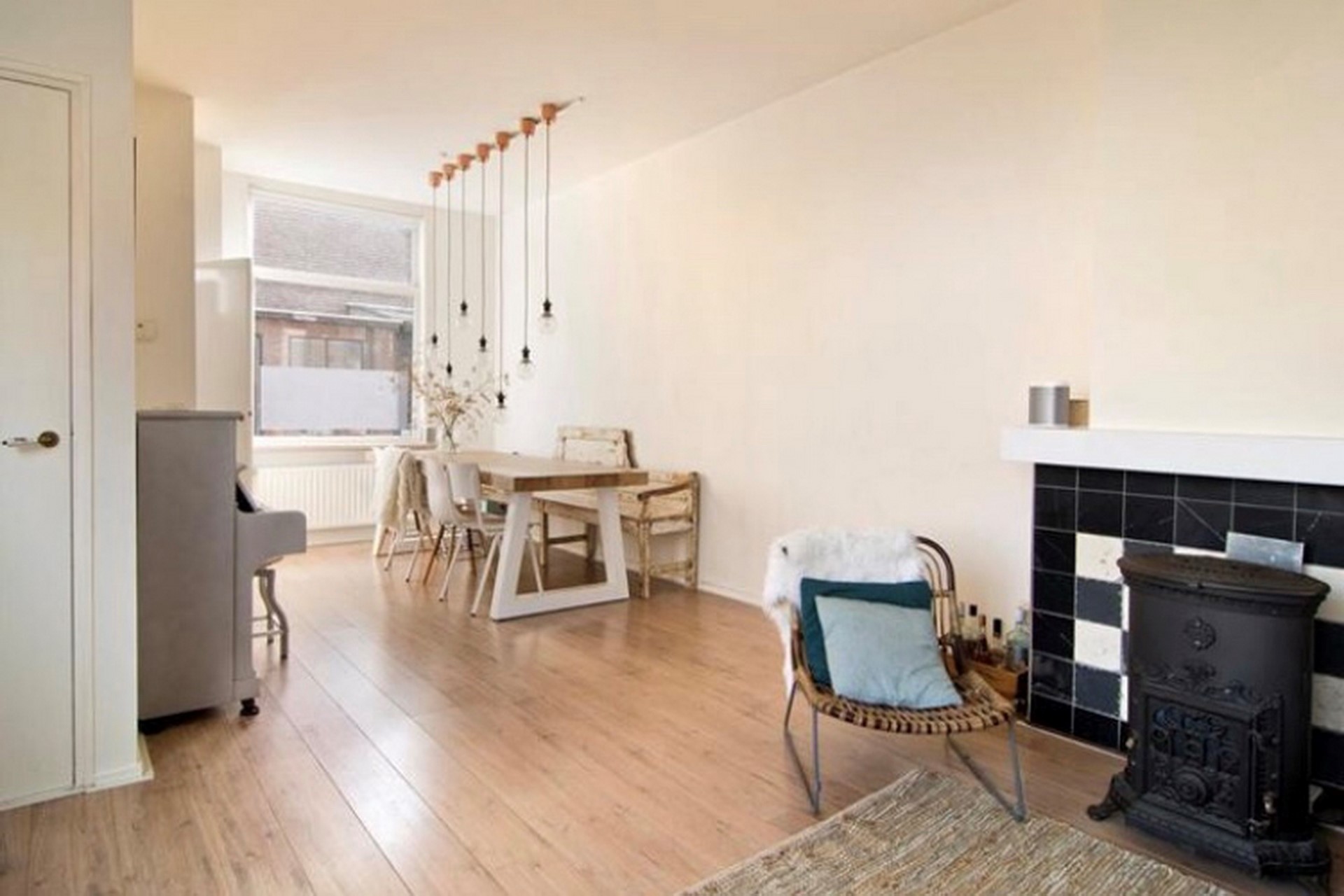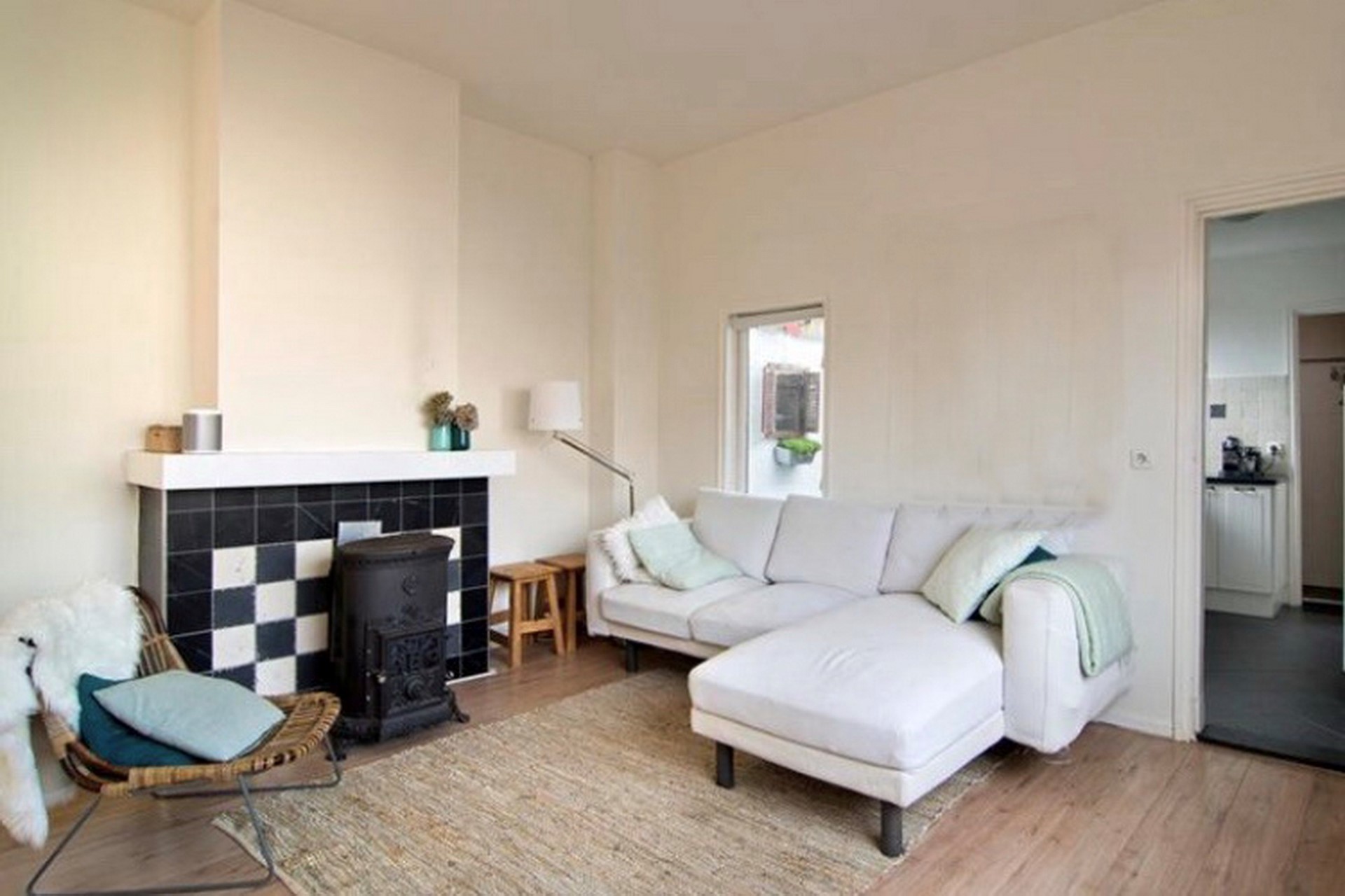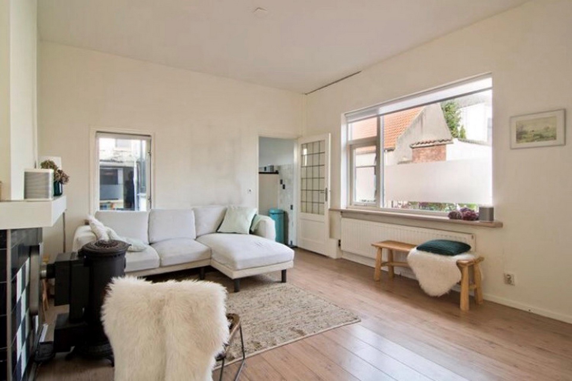 De gezellige L-vormige woonkamer is uitgerust met een potkachel (gaskachel)en heeft grote ramen zowel aan de voor-, achter- en rechterzijde. Vanuit de living bereiken we de keuken en het achterliggende toilet. De vloer is afgewerkt met een laminaat in een lichte kleurstelling. De wanden zijn strak gestucte en wit gesausd.