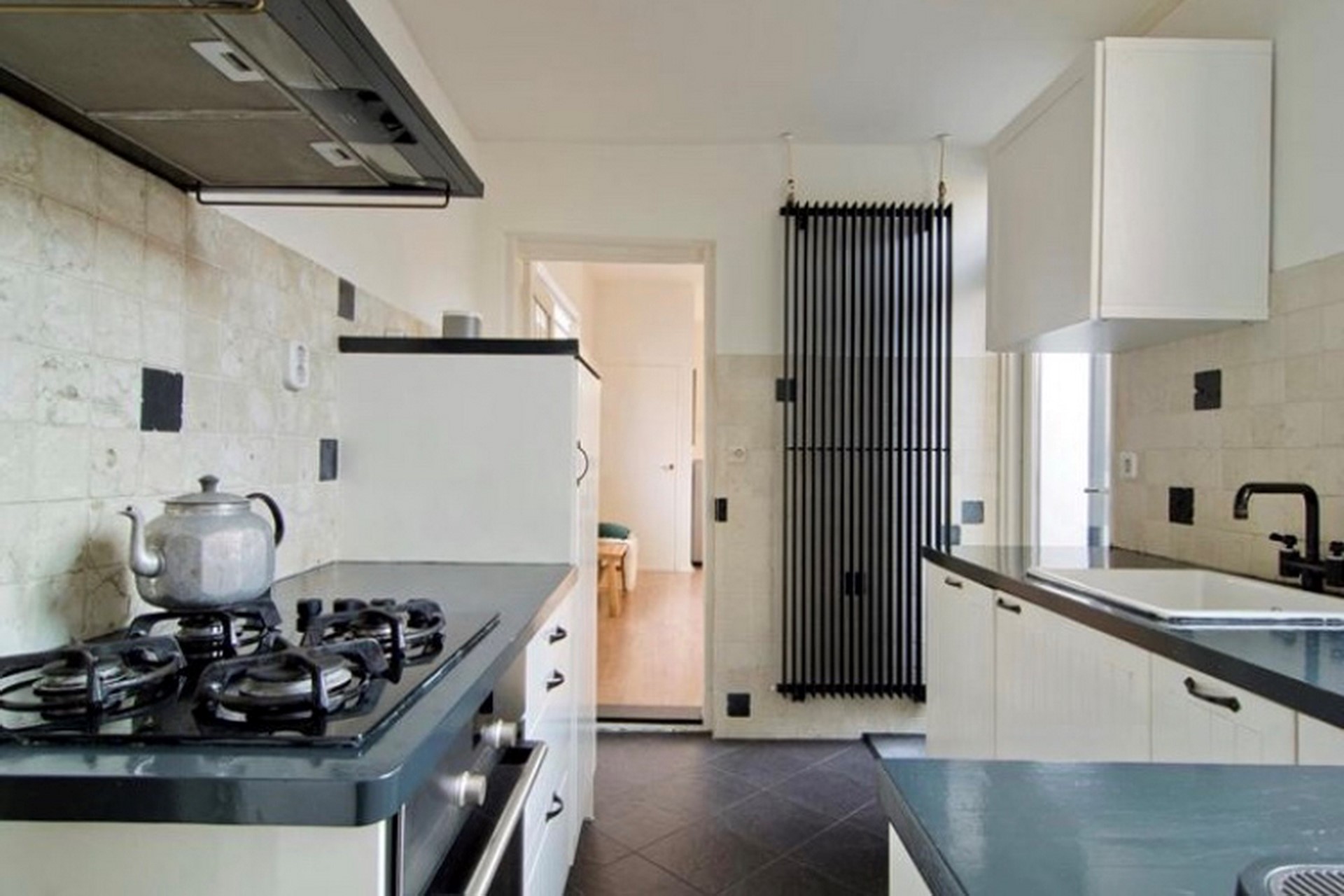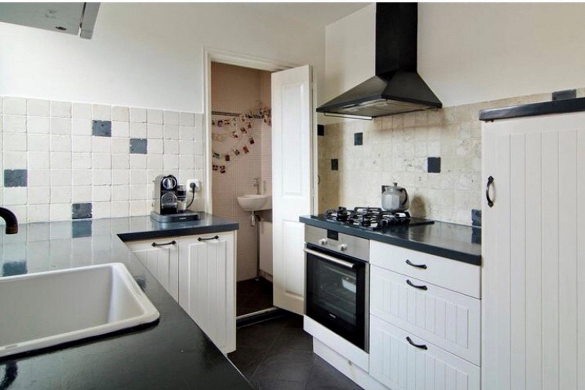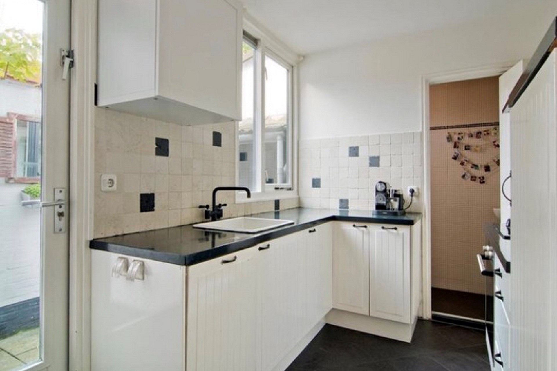 De gesloten keuken heeft een hoek-vormig keukenblok. Het keukenblok is afgewerkt met een donkerkleurig, kunststof keukenblad. De keuken is uitgevoerd met diverse inbouwapparatuur zoals, koelkast, 4-pits gaskookplaat met oven, afzuiginstallatie, vaatwasser en oven. De wanden zijn voor de helft voorzien van wandtegeltjes. De vloer is afgewerkt met antracietkleurige plavuizen. Deur naar binnentuin(plaats).