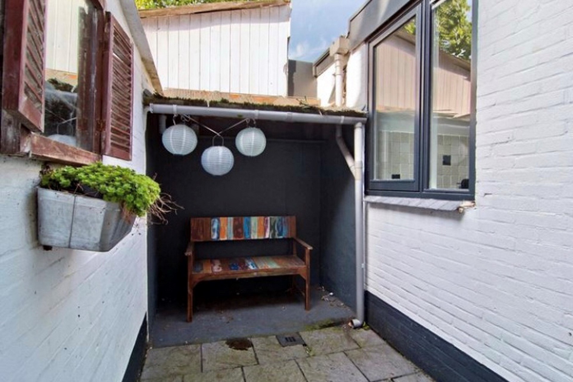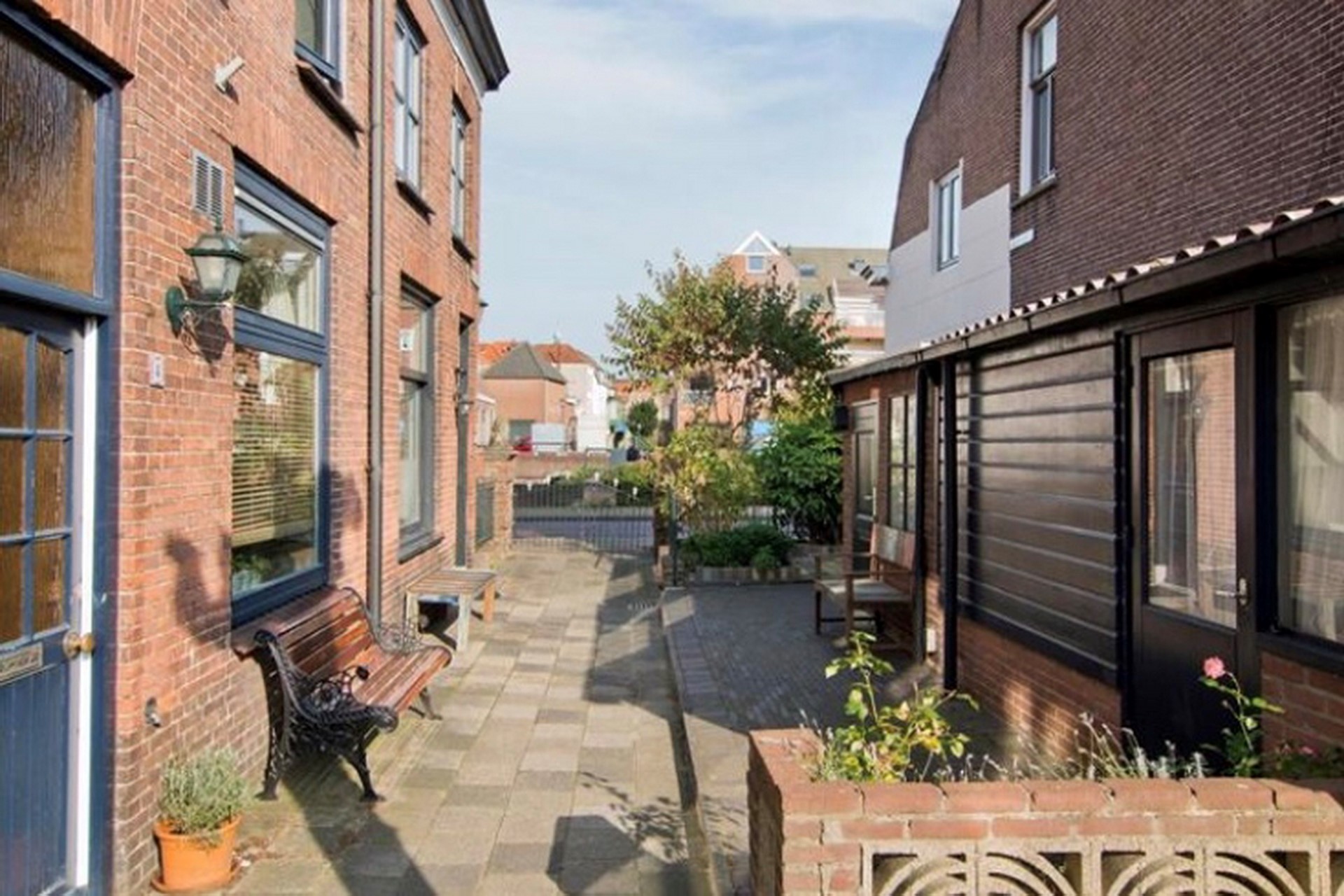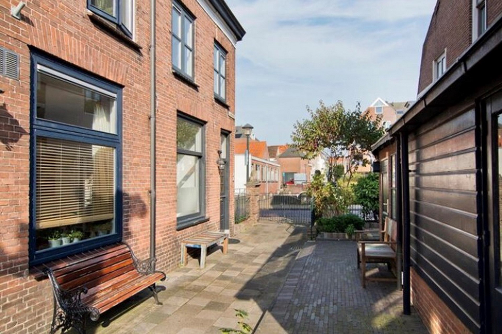 Via de keukendeur kunt u de kleine binnenplaats bereiken. Hier kunt u zitten. De stenen berging is gesitueerd aan de voorzijde van de stadswoning. Tevens is hier een gezellig terras gecreëerd. De tuin naast het huis behoort niet toe tot de eigenaar, maar hier mag wel gebruik van worden gemaakt.