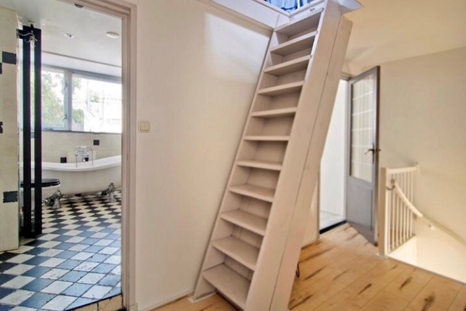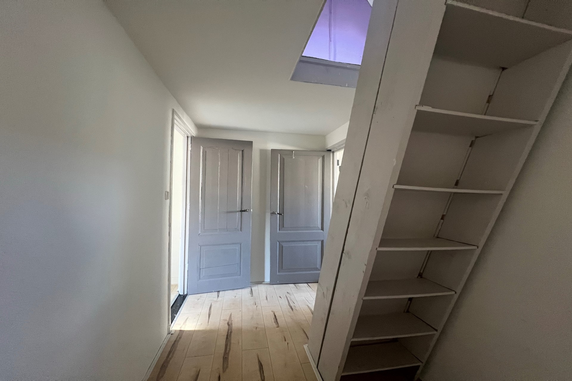 de trapopgang naar de zolder. Vloer laminaat (lichte kleurstelling). Wanden : spuitwerk (wit). Plafond: spuitwerk (wit)