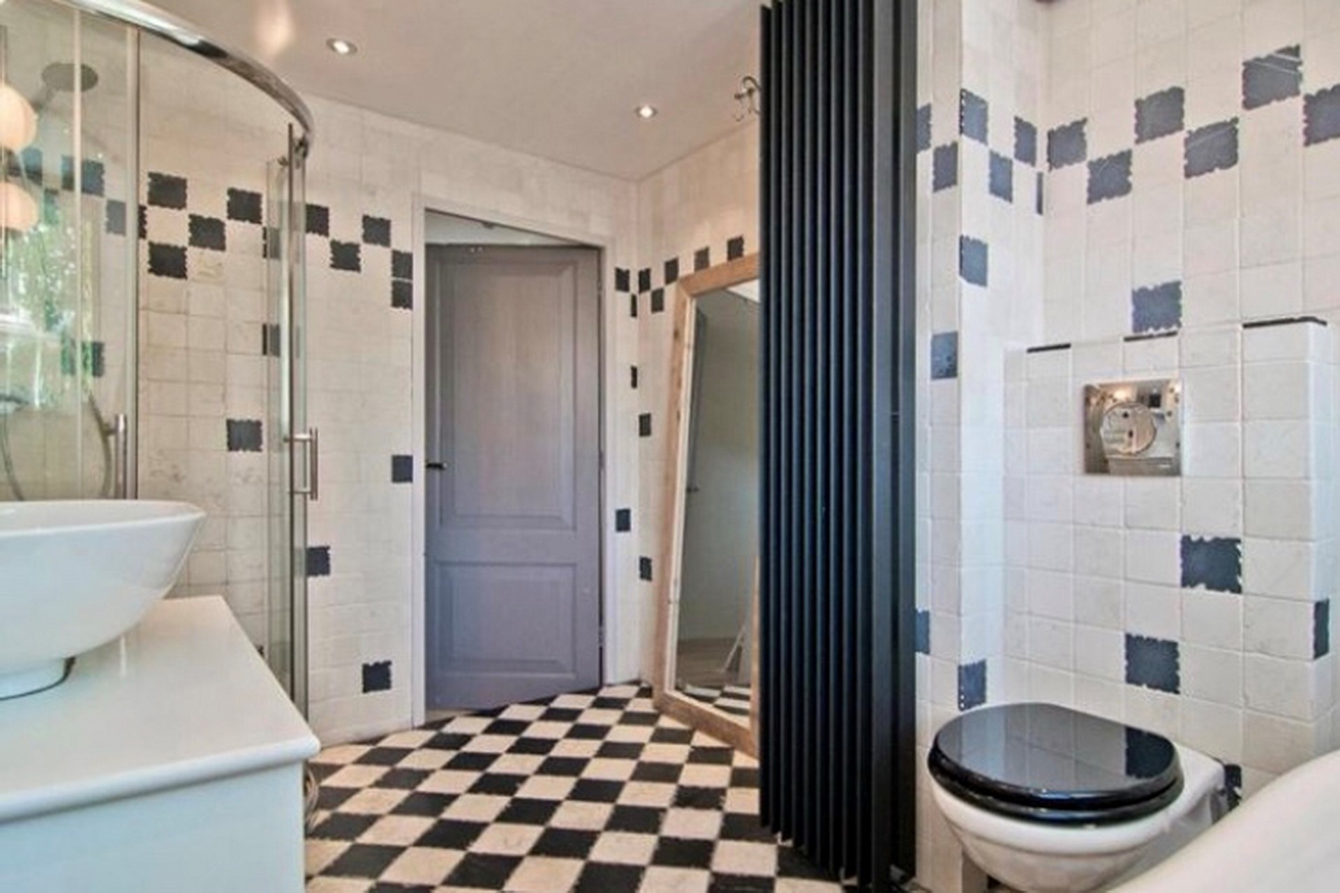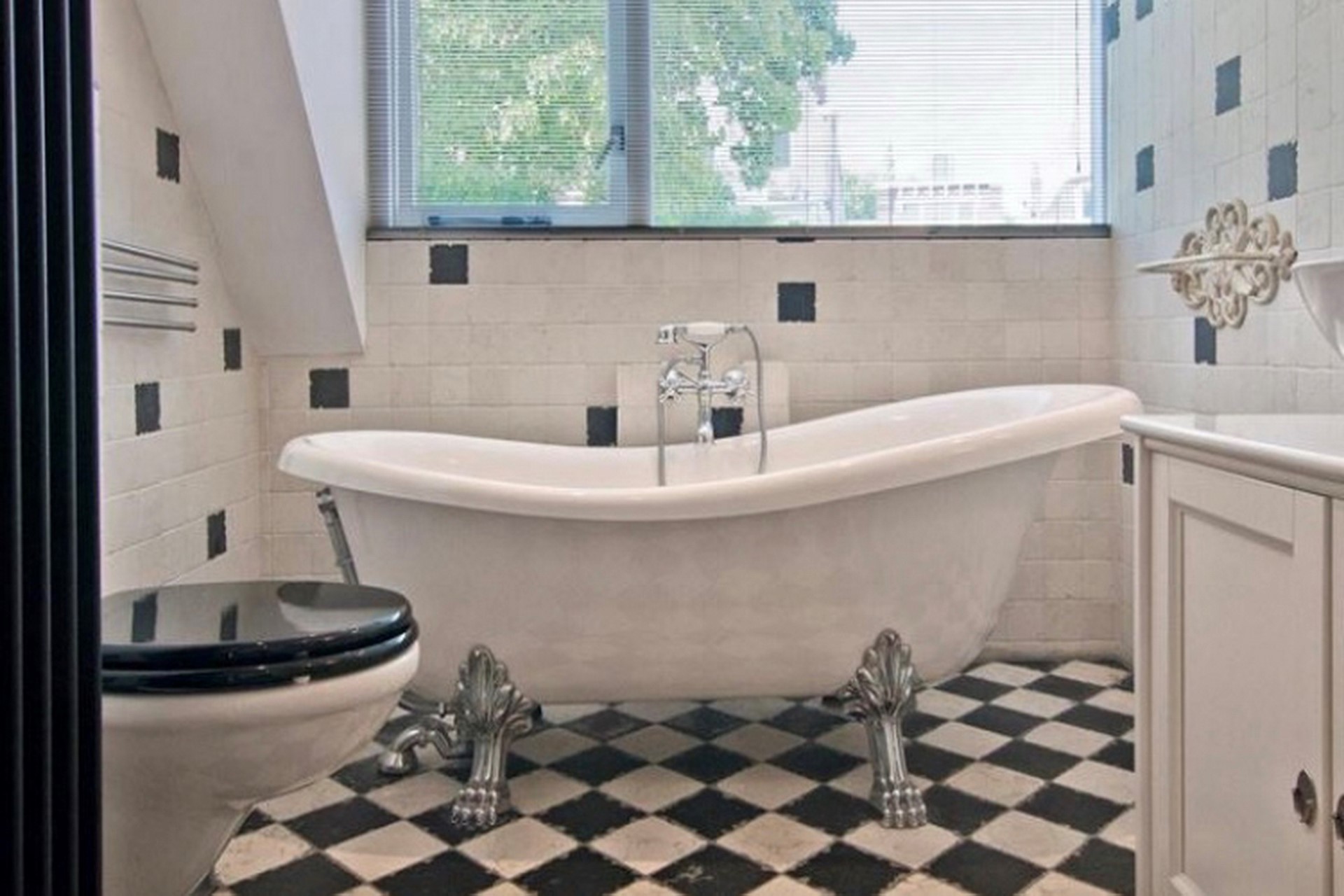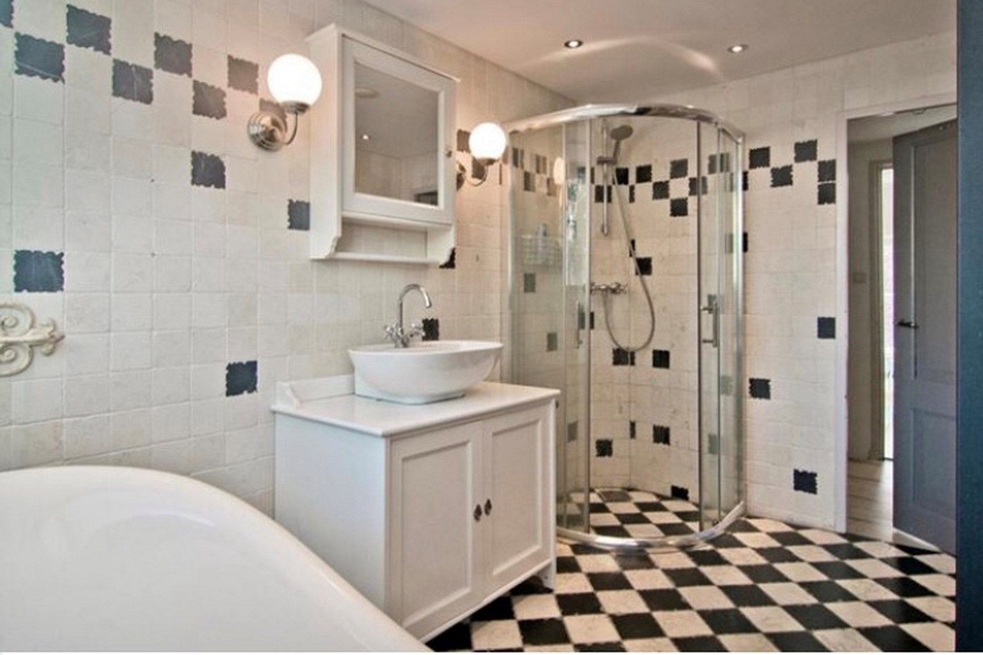 De sfeervolle badkamer is voorzien van een bad op pootjes, aparte douchecabine en wastafel inclusief meubel. De vloeren en wanden zijn afgewerkt met wit/ grijze kleurstelling tegels/ plavuizen. Vloer: plavuizen (grijs/wit). : Wanden: tegelwerk (wit met enkele grijze tegels). Plafond : spuitwerk (wit). Inbouwspots.