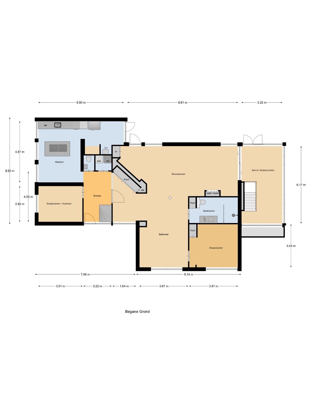 Links naast de voordeur vindt u een kamer van ca 10m² welke nu dienst doet als werkkamer maar welke ook in te richten is als slaapkamer of bijvoorbeeld een kantoor, praktijk of salon aan huis.