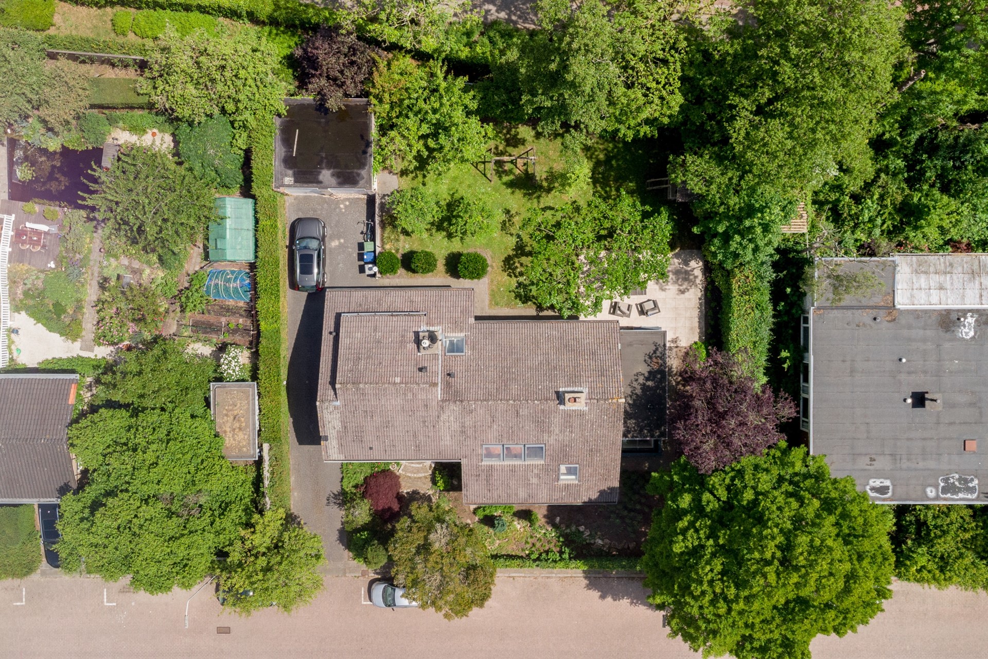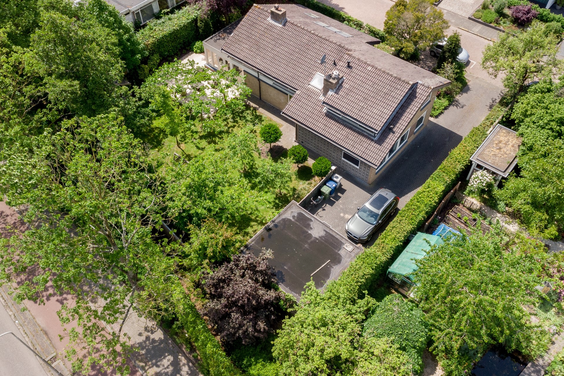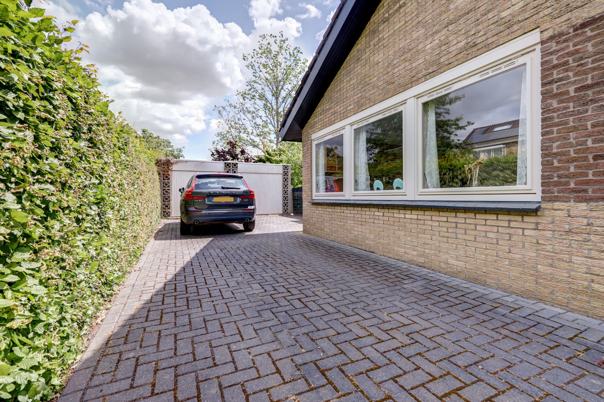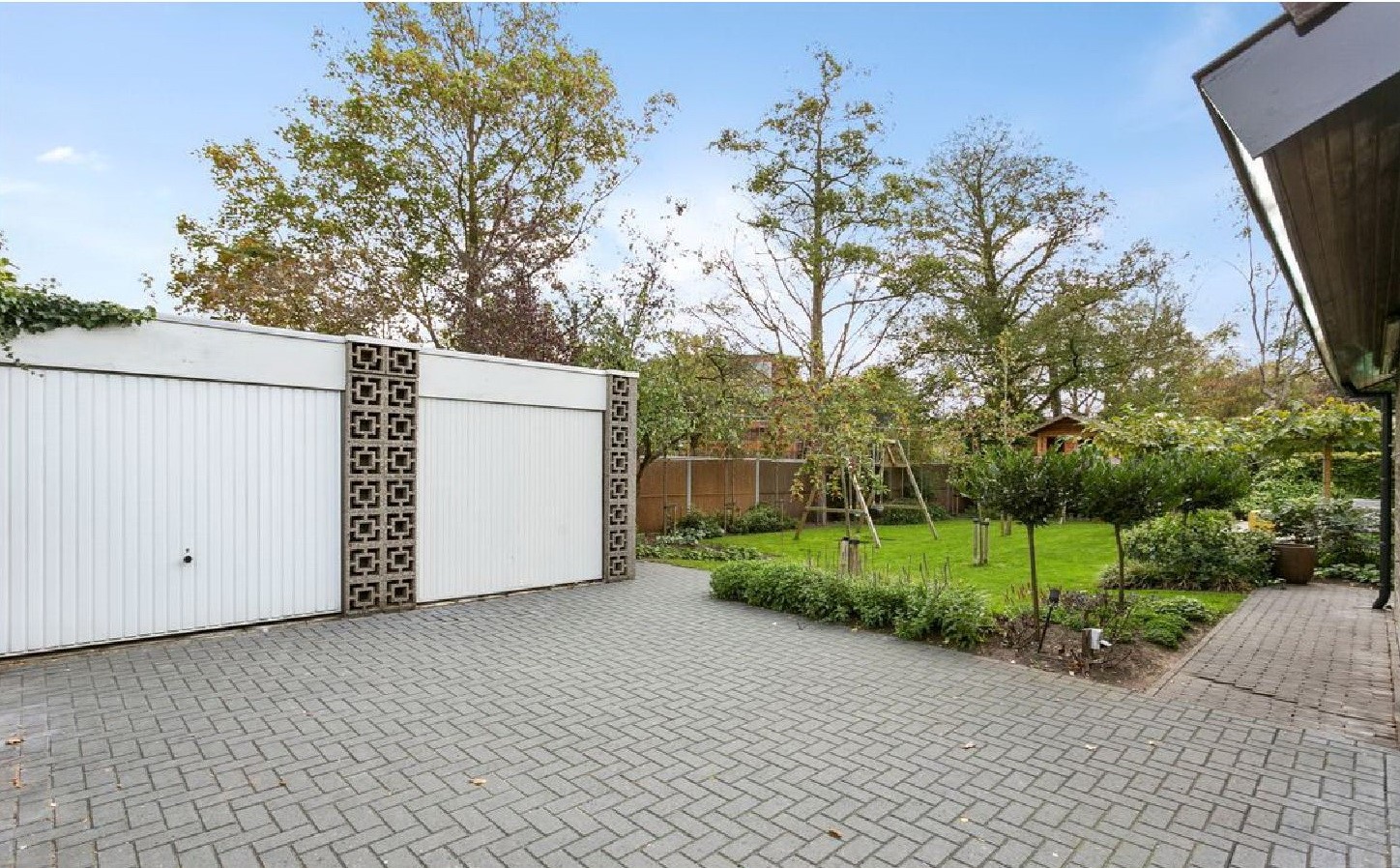 De voortuin is ruim opgezet, de eigen oprit aan de zijkant biedt plaats voor het parkeren van meerdere auto's op eigen terrein (laadpaal aanwezig) en geeft toegang tot de dubbele garage. De garage heeft elektrische deur en een zijdeur.