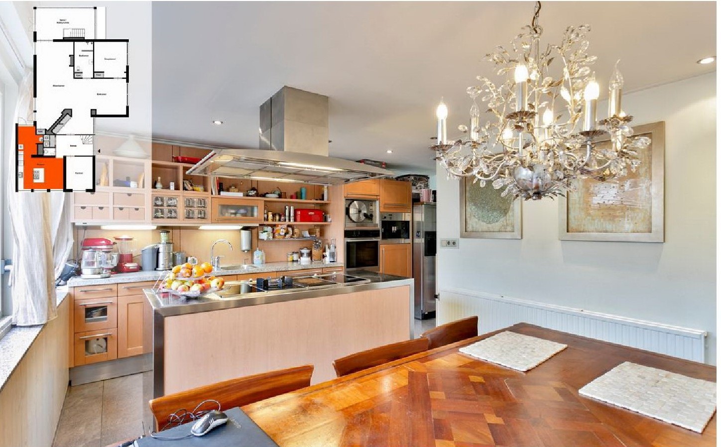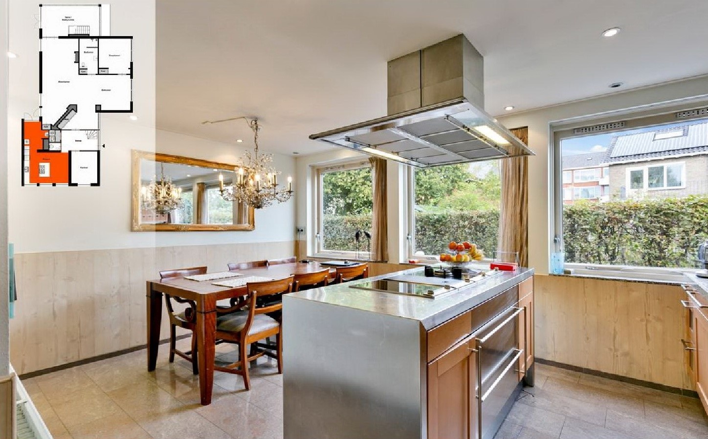 De ruime woonkeuken van ca 17 m² is heerlijk licht door de grote ramen en geeft ook toegang naar de achtertuin via de bijkeuken van ca 7m². Het kookeiland biedt veel werkruimte en verder is de keuken ingericht met diverse luxe apparatuur(o.a. Amerikaanse koelkast, stoomoven, oven, inbouw espressomachine, wokbrander, keramische kookplaat, inbouw frituur, afzuigkap, vaatwasser en spoelbak.