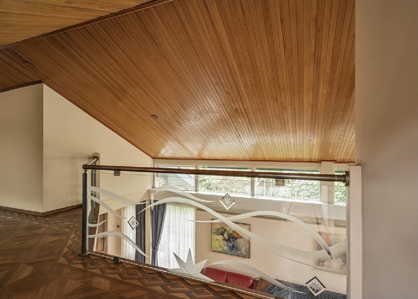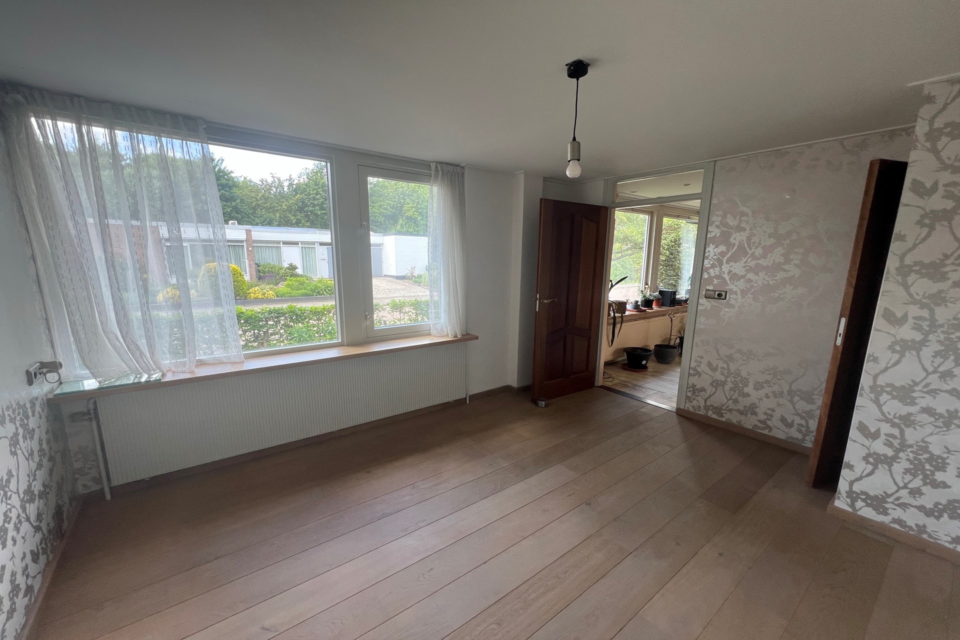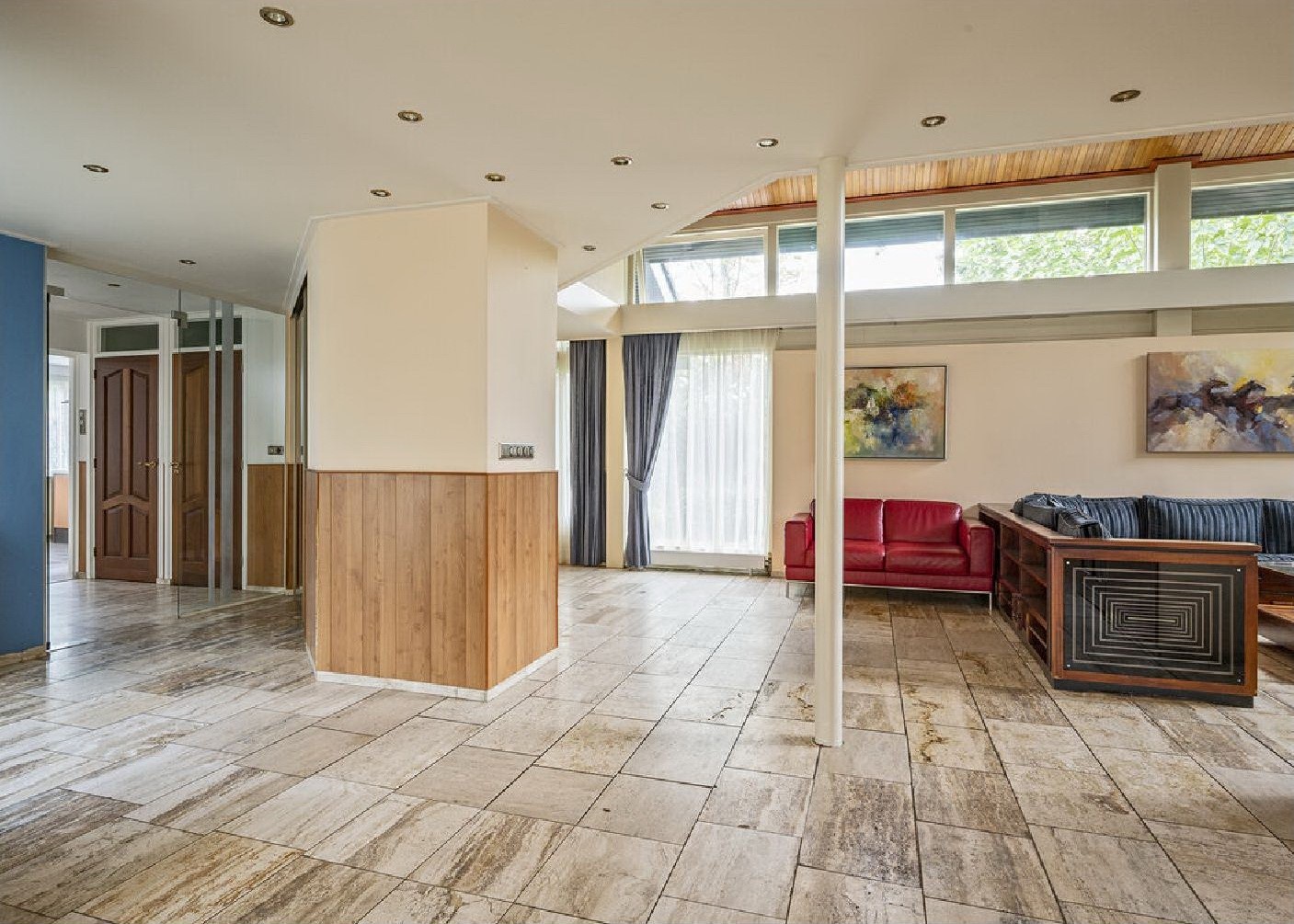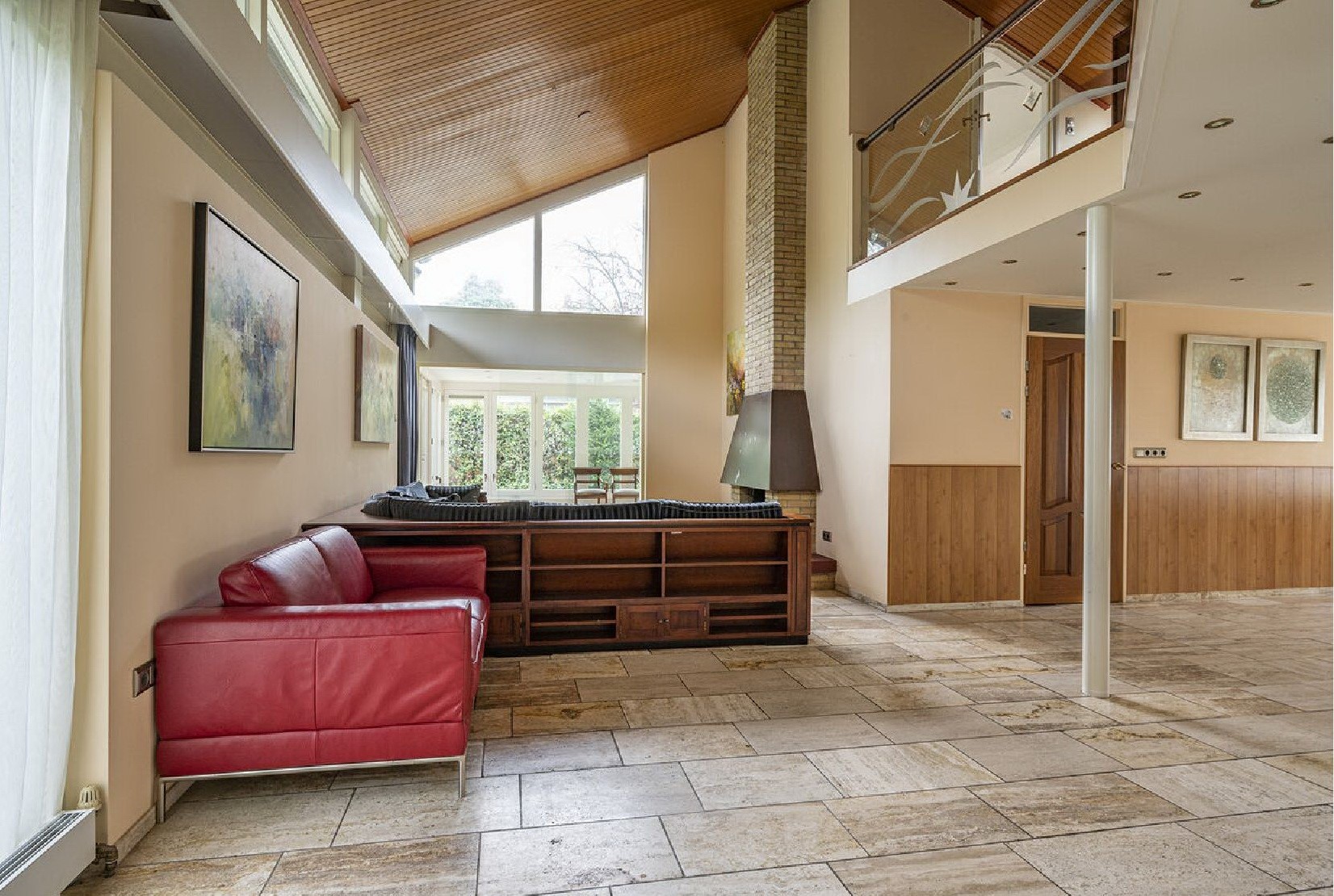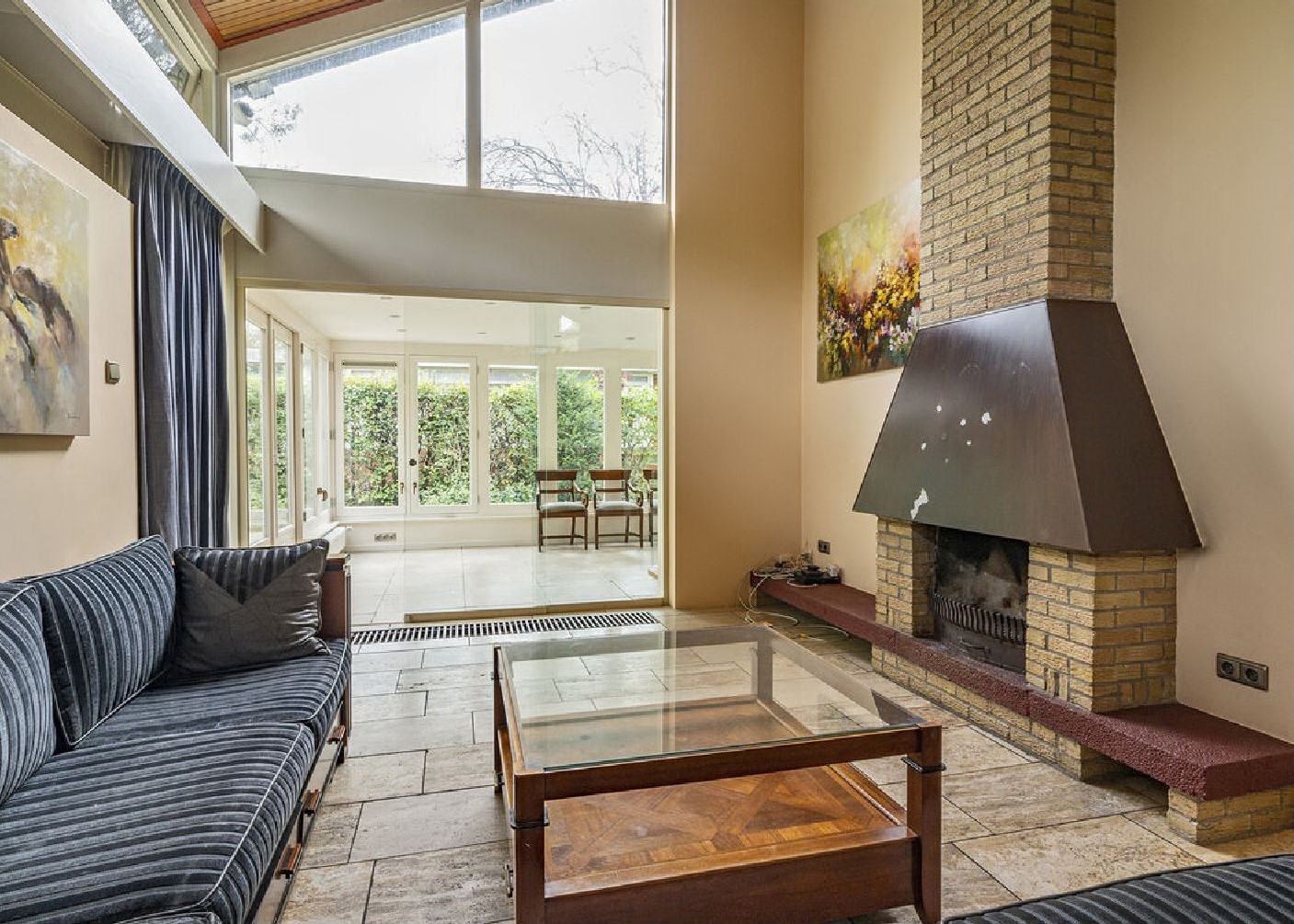 De sfeervolle woonkamer va ca 59m² heeft een mooie lichtinval door de hooggeplaatste ramen. Het ruimtelijke gevoel wordt versterkt door de nokhoogte en de "zwevende" vide. Voor extra sfeer een openhaard met een robuuste schoorsteen tot aan de nok. Aangrenzend is er een mooie lichte serre van ca 20m² met openslaande deuren en ramen waar het heerlijk toeven is al in het vroege voorjaar tot in het late najaar. Zo kunt u extra lang genieten van uw mooie tuin. Vanuit de serre kunt u naar de kelder welke nu ingericht is als muziekstudio.