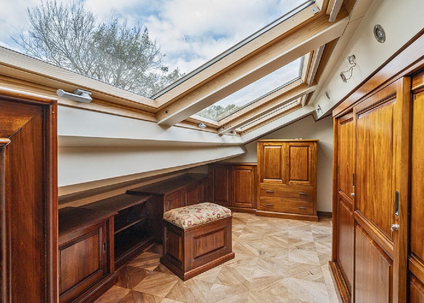 De bergruimte heeft 3 dakramen en een vaste kastenwand