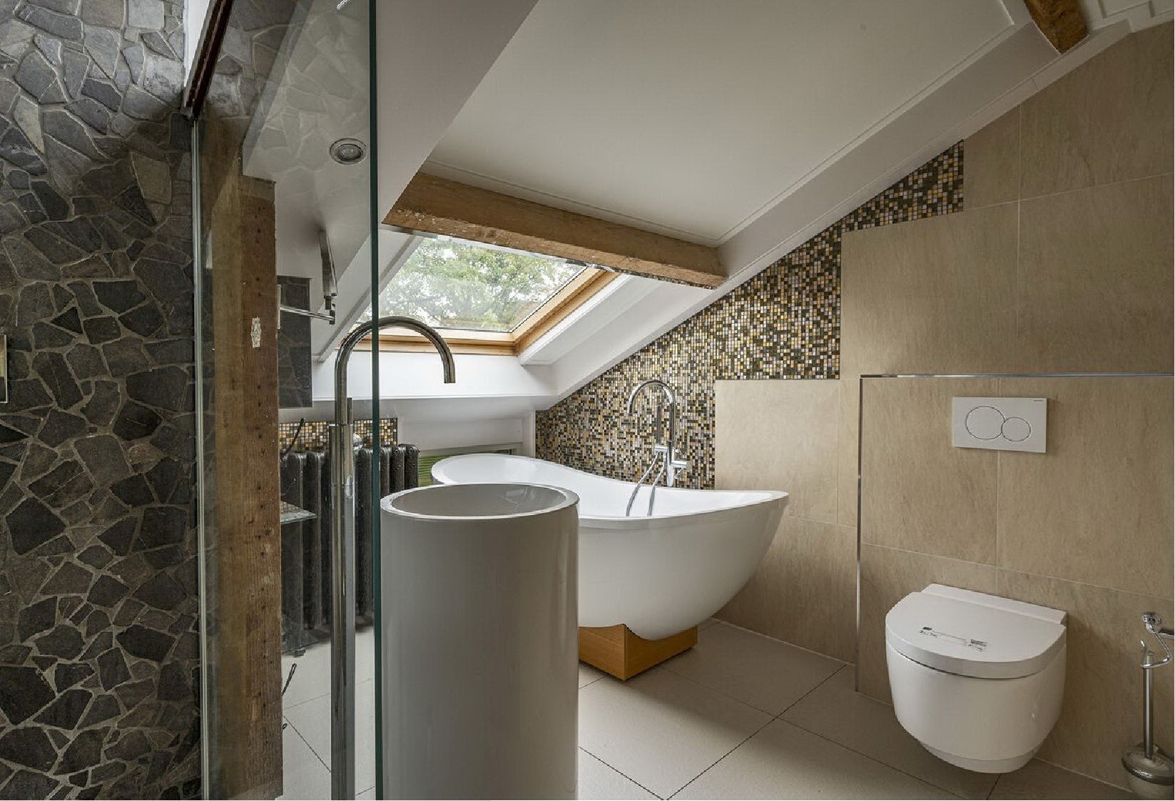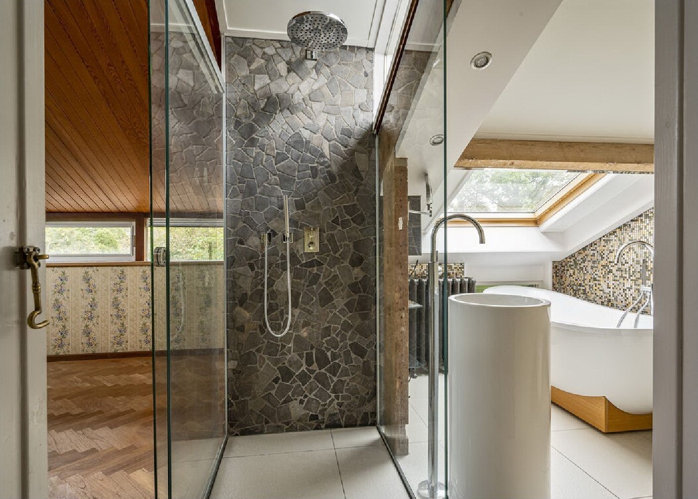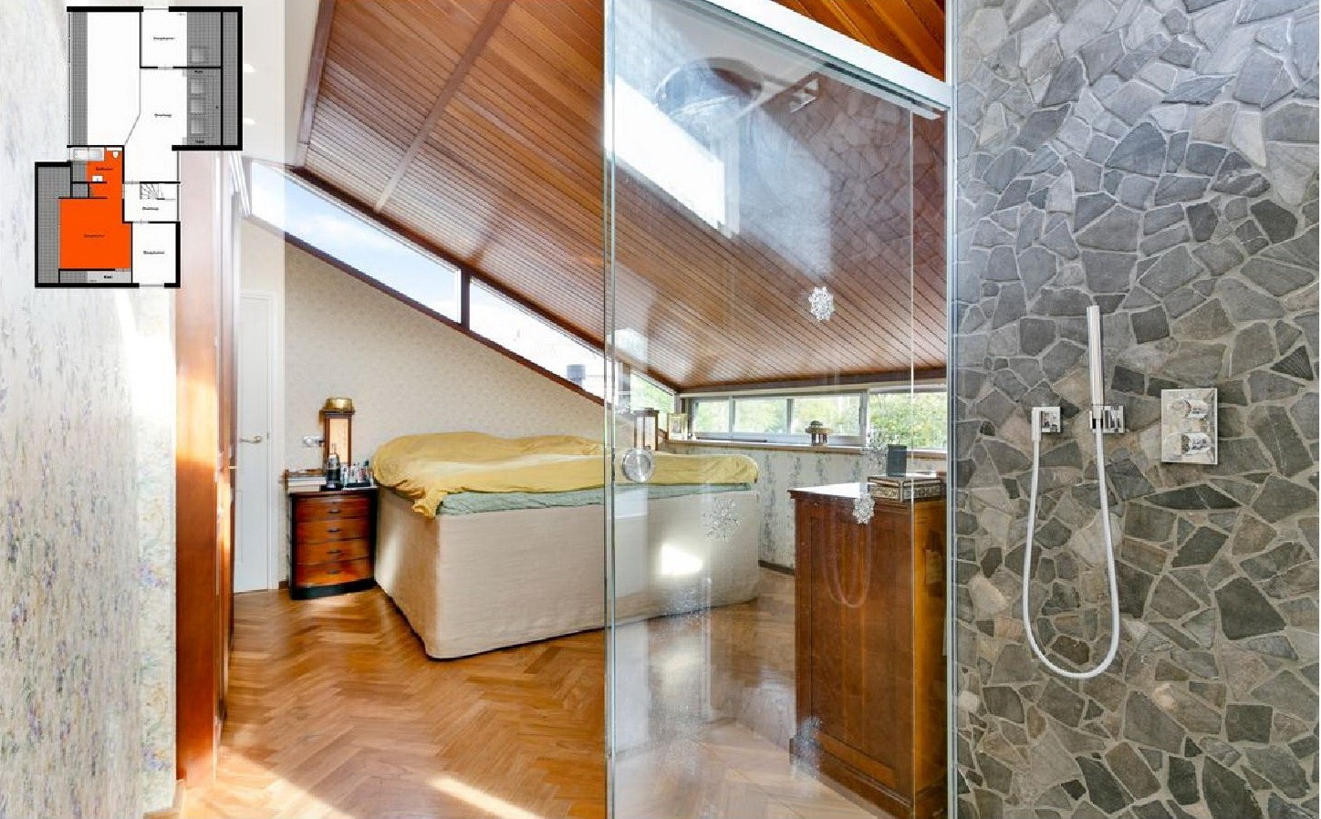 een aaneengesloten badkamer van ca 8.5 m² voorzien van inloopdouche, ligbad, wastafel en zwevend toilet. De gehele verdieping heeft fraaie parketvloeren.