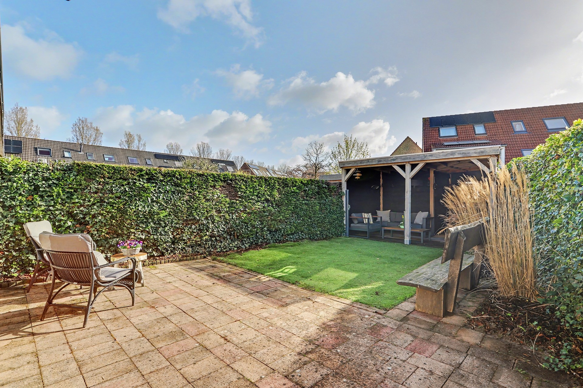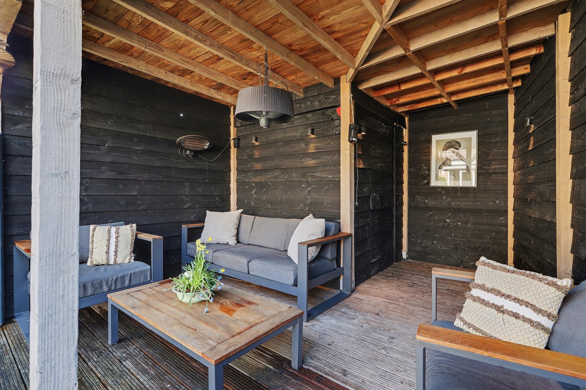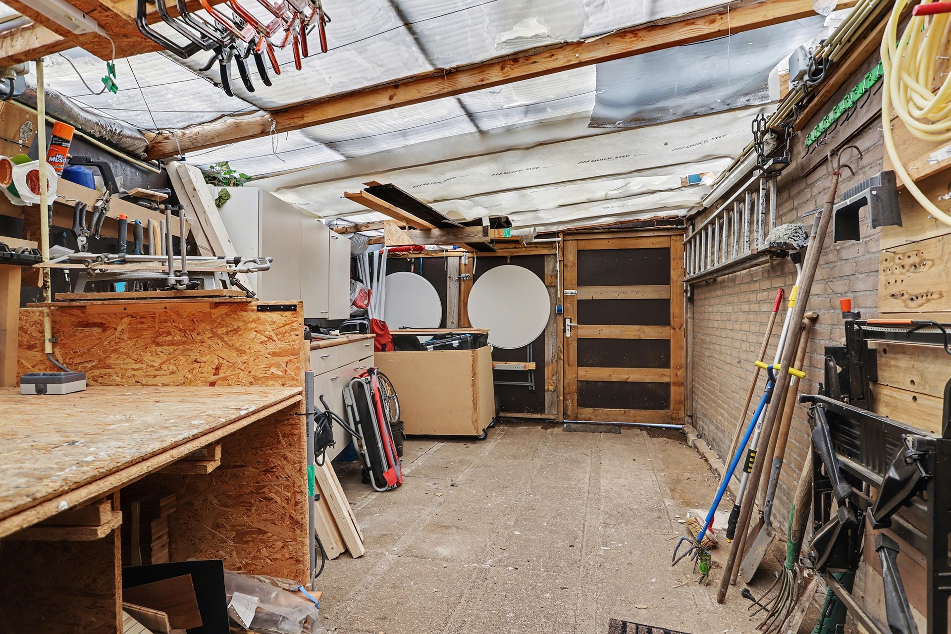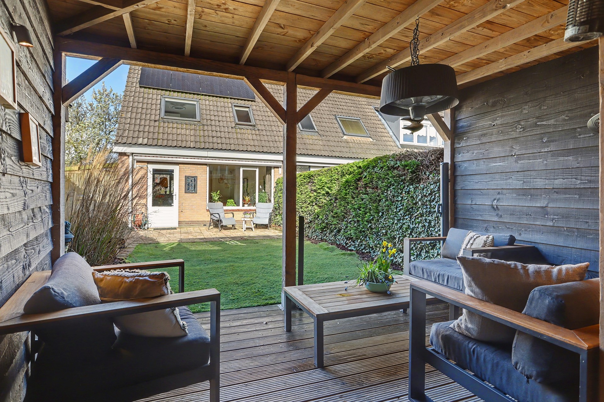 Ook buiten is het genieten. De overkapping in de achtertuin nodigt uit tot lange, gezellige avonden. Dankzij de beschutte ligging kun je hier vrijwel het hele jaar comfortabel zitten. De kleine schuur is netjes weggewerkt onder de overkapping en direct naast de woning bevindt zich een ruime hobbyschuur – ideaal voor fietsen, gereedschap en opslag.