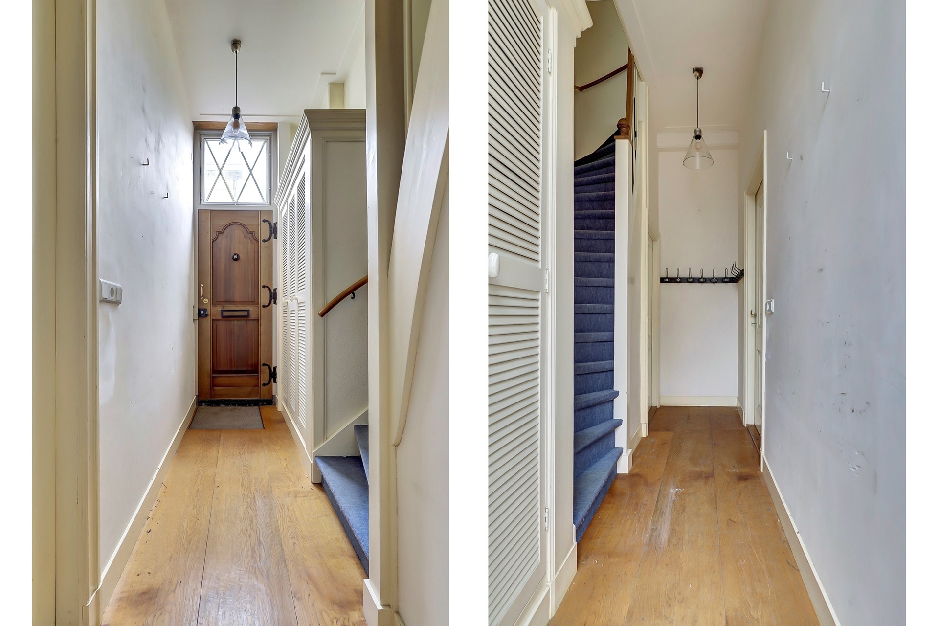 Entree met garderobekast en meterkast (5 groepen + aardlekschakelaar), gang met toegang naar de kelder, trapopgang en voorkamer. Voorkamer met schouw en gaskachel, vensterluiken. Via de voorkamer bereik je de achterkamer met authentiek keukenblok. Toiletruimte en aansluiting voor een wasmachine. Via zijdeur of voor gelegen toegangsdeur bereik je de (fietsen)berging van ca 10 m².