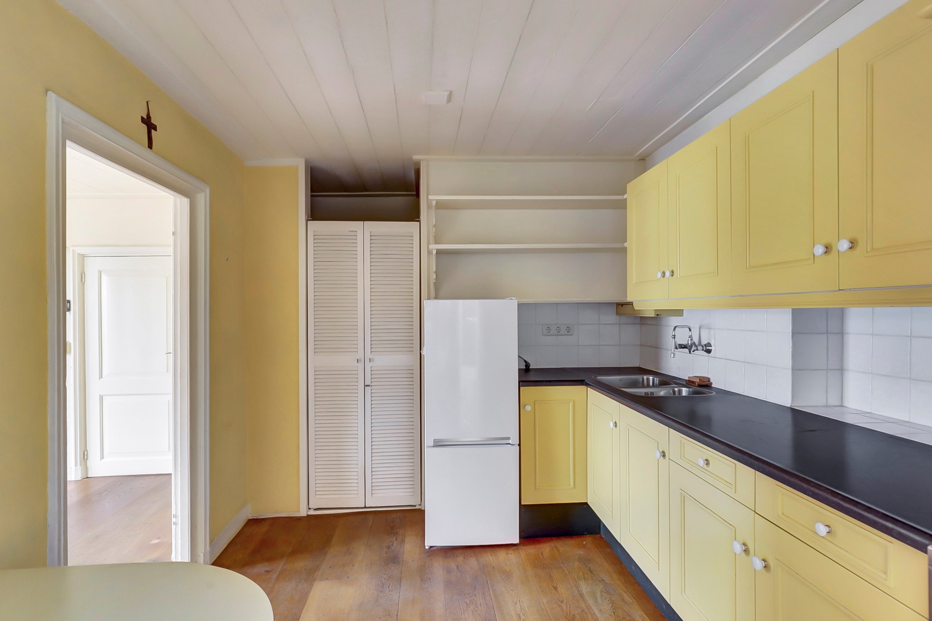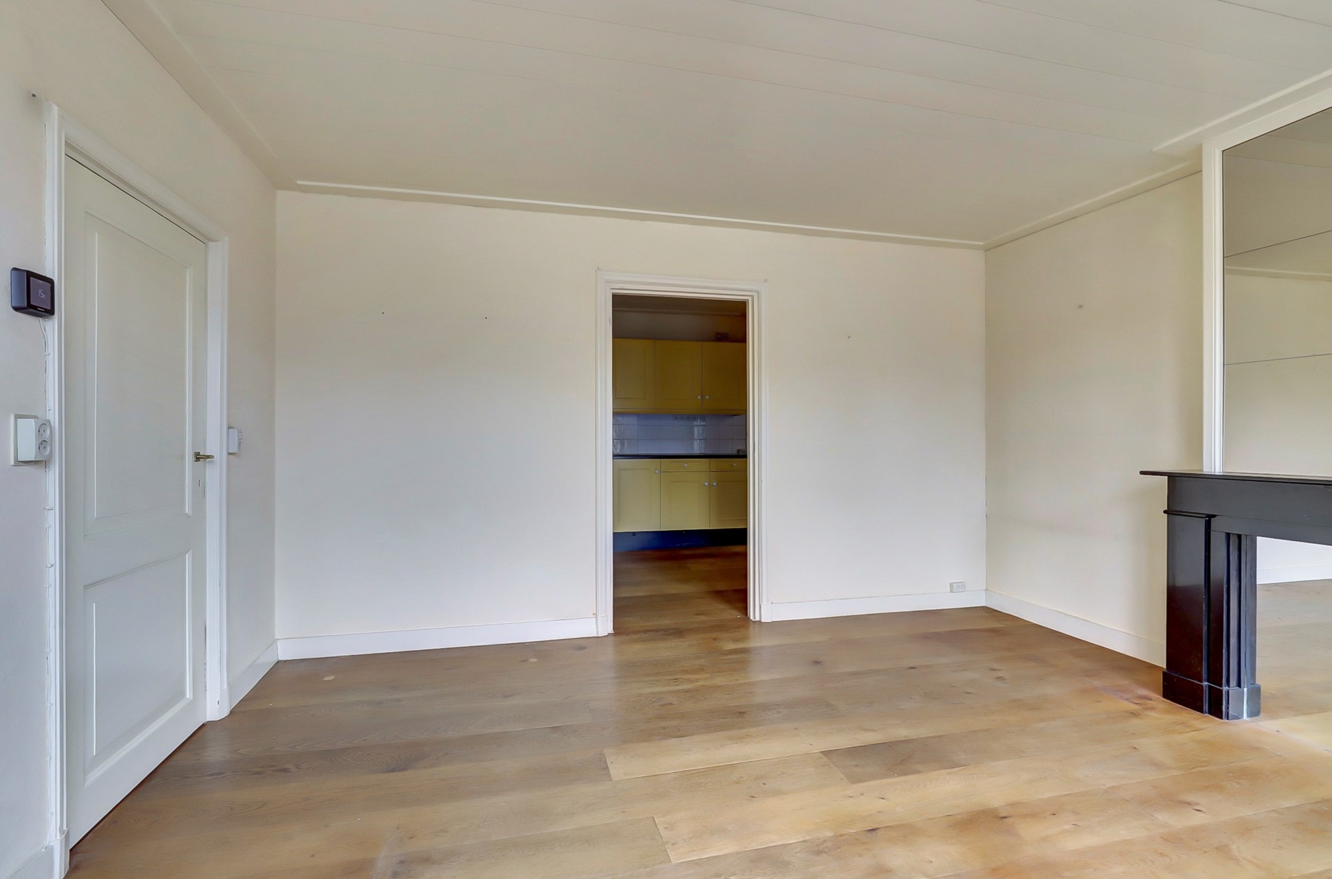 Overloop met nis en toegang naar het toilet en de woonkamer. De woonkamer heeft een marmeren schouw en geeft toegang tot de achter gelegen keuken. De keuken is voorzien van een gasfornuis, afzuigkap en een losse koel-vriescombinatie. Naast de keuken is badkamer met zitbad en wastafelmeubel. Via de zijdeur bereik je het balkon met meerdere niveaus.